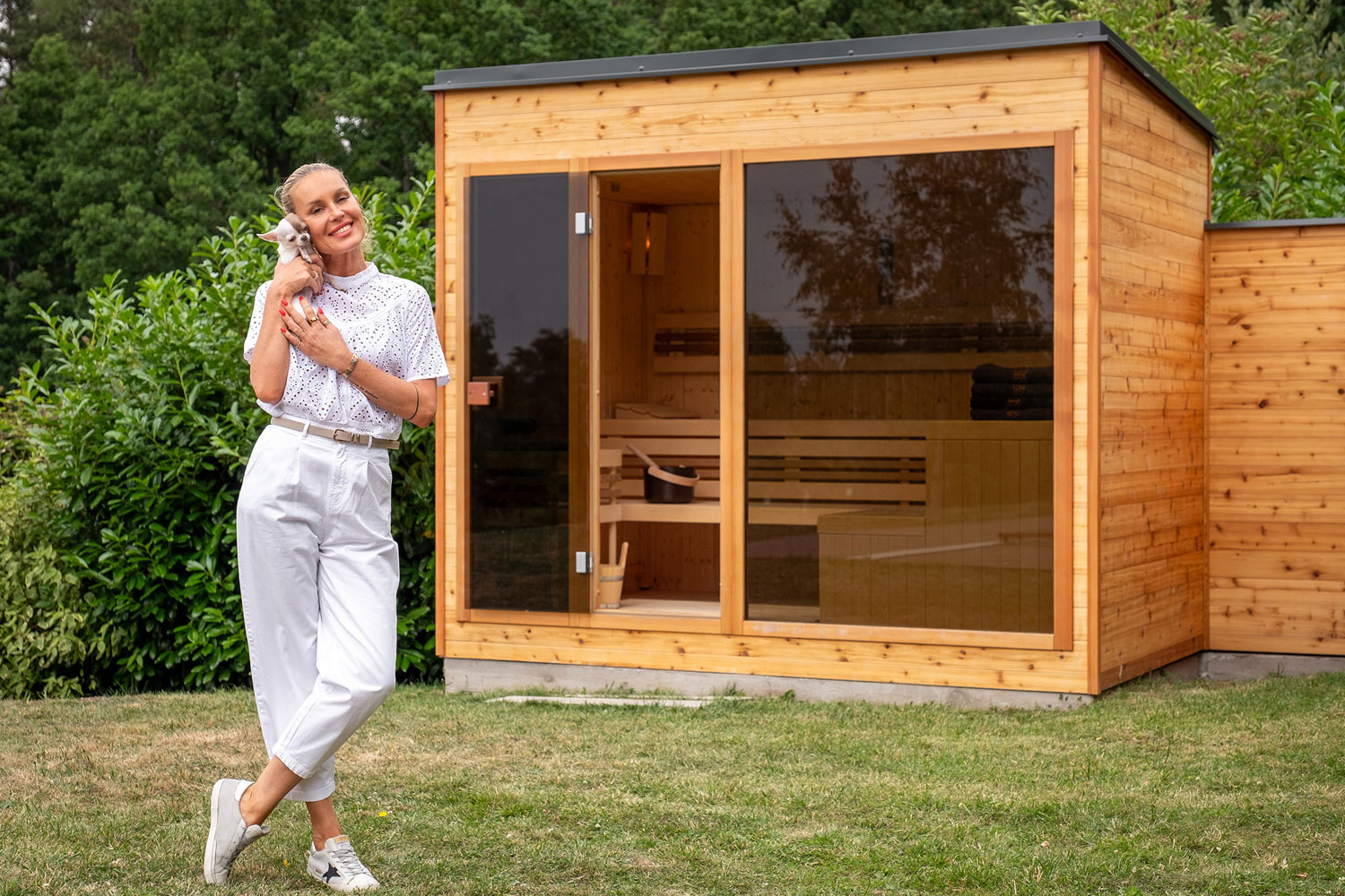 A právě proto na její zahradě vznikla sauna, která odráží její styl – přirozená a dokonalá v každém detailu.