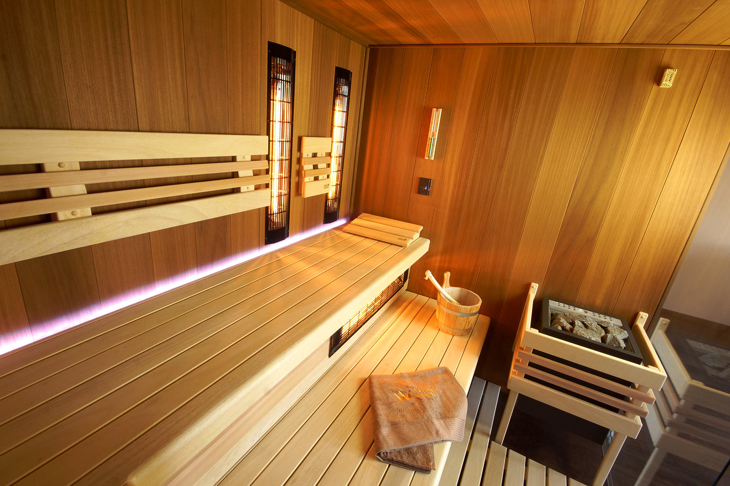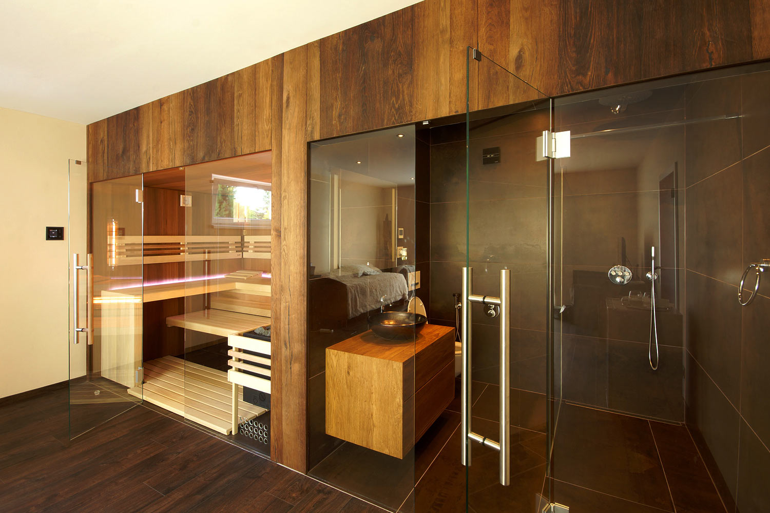 Hlavní roli v tomto privátním wellness hraje naše sauna Native – ale díky rozsáhlé individualizaci byste ji možná ani nepoznali. Přední stěna sauny je plně prosklená čirým bezpečnostním sklem o síle 8 milimetrů. Dveře mají magnetické zavírání a luxusní panty. Saunování zpříjemňuje audio systém s možností připojení dalšího zdroje zvuku přes Bluetooth a RGB LED podsvícení za lavicemi. Sauna je připravená i na možnost dálkového ovládání přes mobilní telefon v budoucnu.