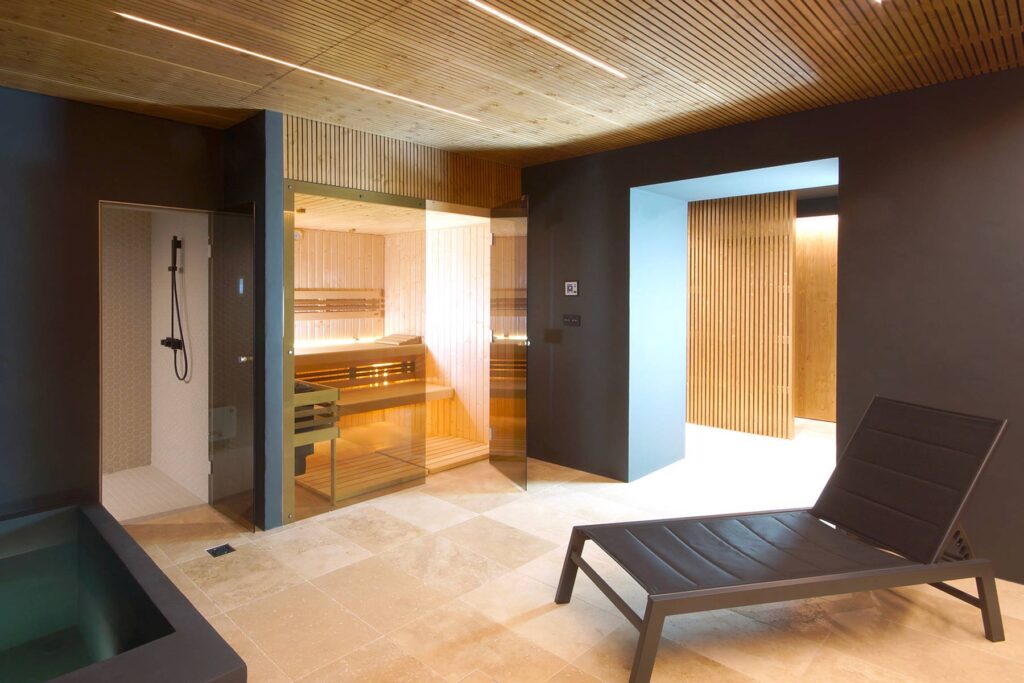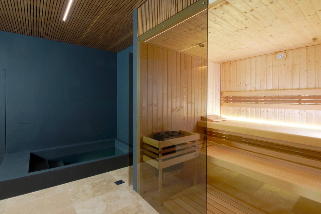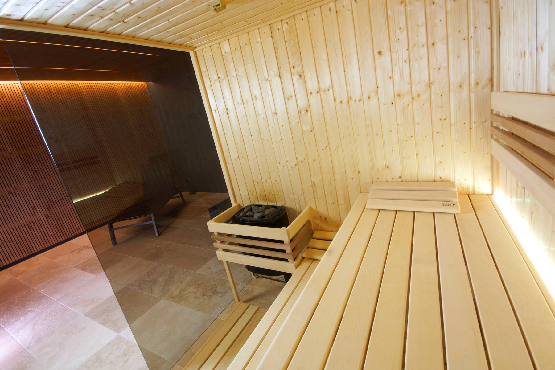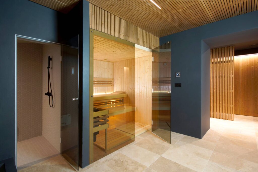 Stěny sauny jsou obložené skandinávským smrkem, lavice a opěrky kombinují dřevo africké vrby abachi a cedr. Prosklená stěna je z bronzově zbarveného skla v hliníkovém rámu.