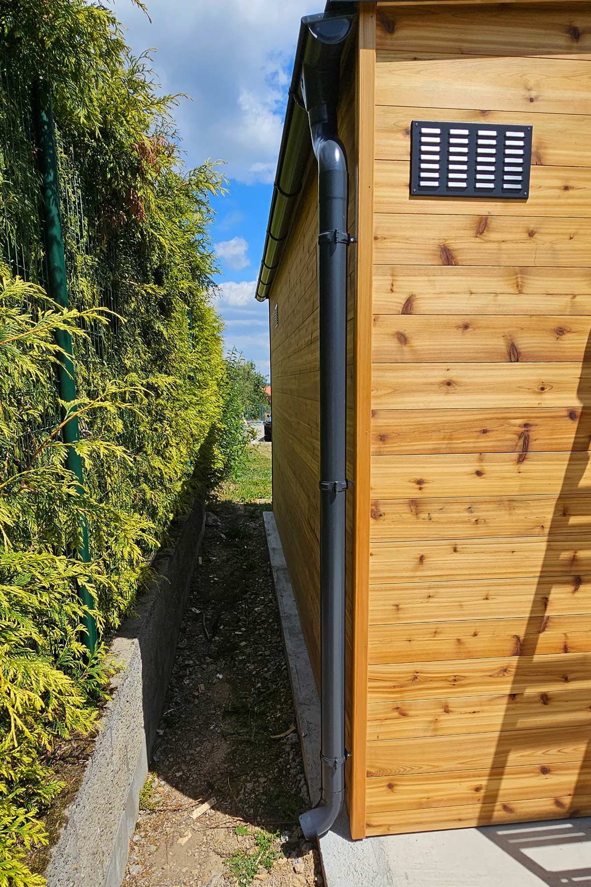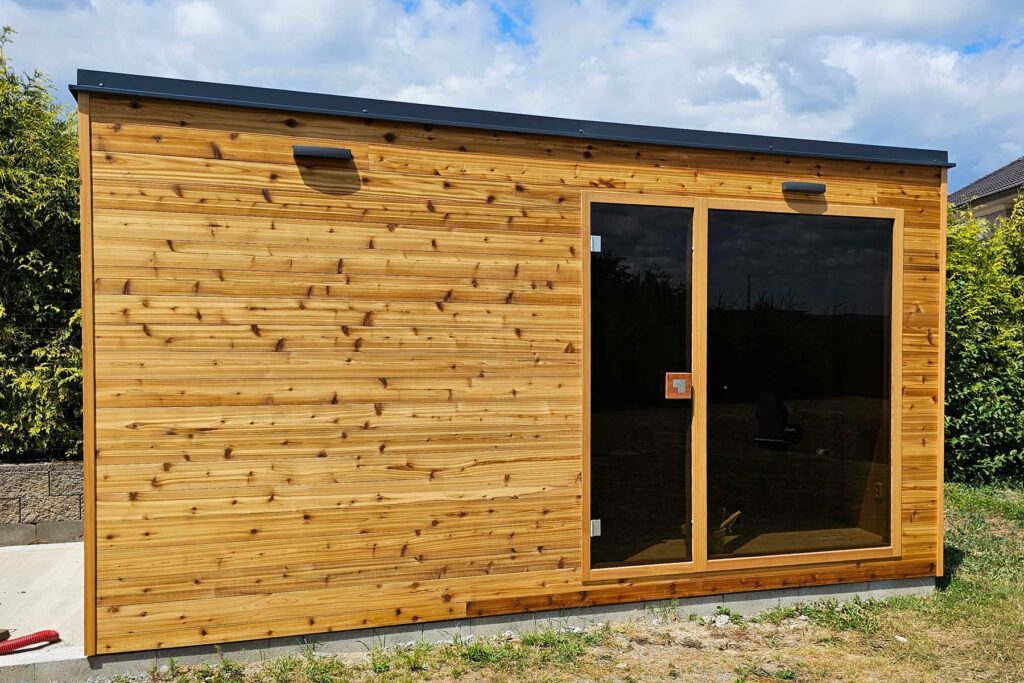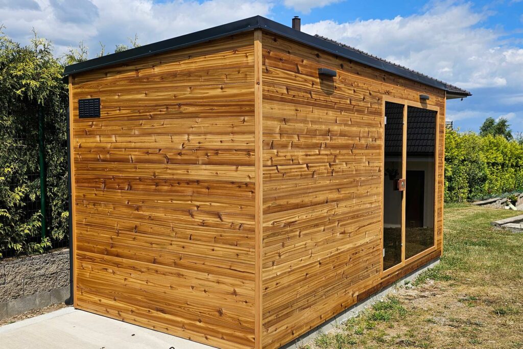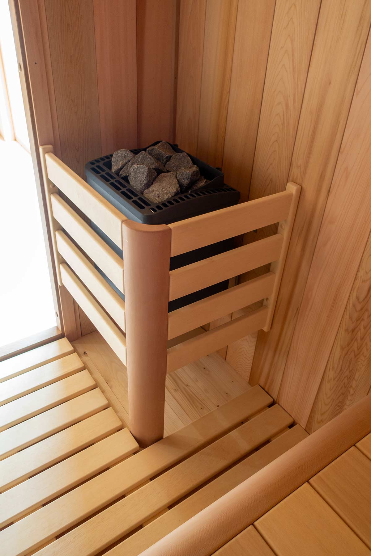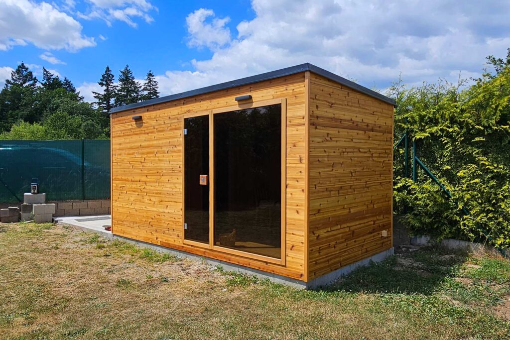 Cedrový ráj. Vůně prémiového cedrového dřeva vás u této sauny provází na každém kroku. Uvnitř i venku. Tam ho před slunečními paprsky chrání bezbarvý UV nátěr OSMO, který zároveň zvýrazní jeho přirozenou krásu. V sauně ani v odpočívárně se nikdy nebudete nudit – skrz prosklené dveře a velké okno od podlahy až ke stropu můžete sledovat proměny zahrady. V zimě, na jaře, v létě i na podzim. Ten je z pohodlí příjemně vyhřáté sauny vůbec nejkrásnější.