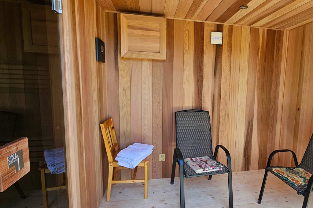 Odpočinek po saunování můžete trávit na lehátku v odpočívárně hned za dveřmi sauny. Nemusíte nikam chodit. Což oceníte hlavně v chladných měsících. A navíc chytře využijete přebytečné teplo ze sauny.