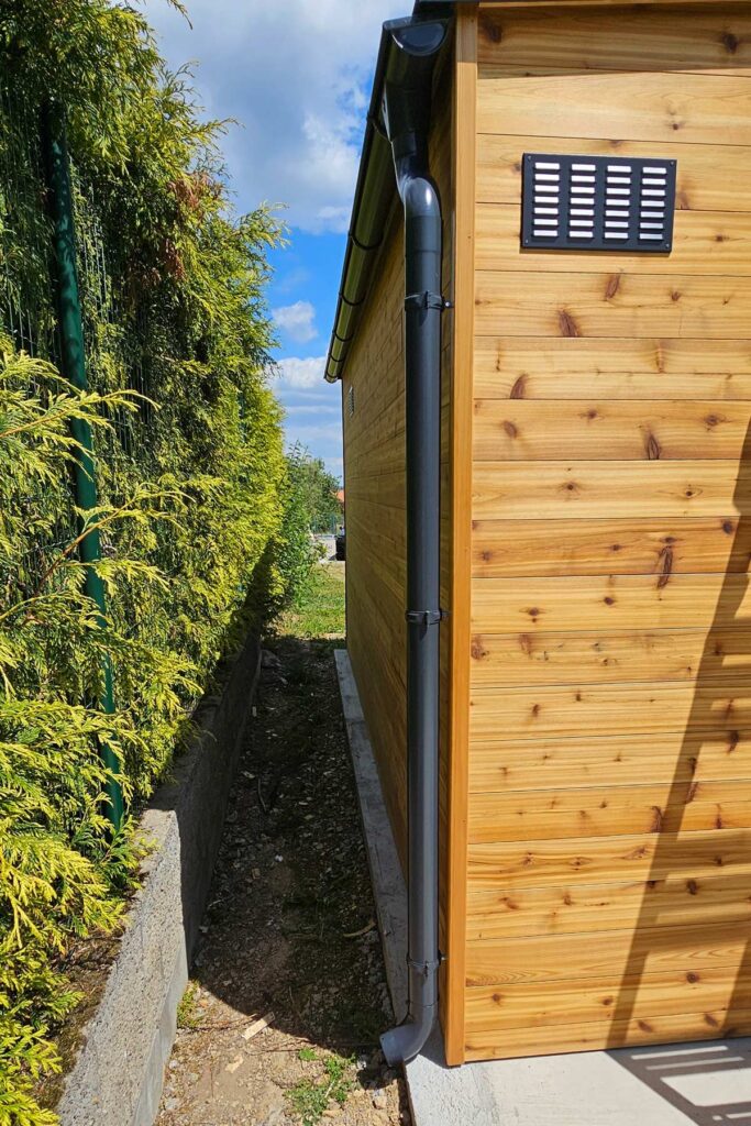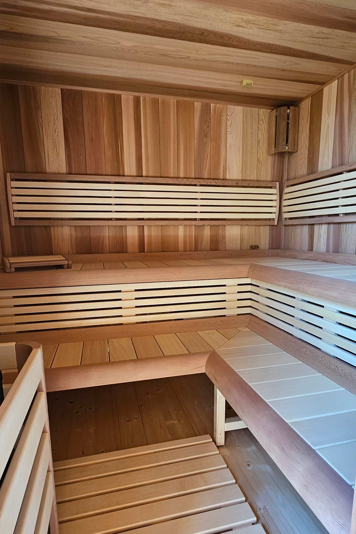 Voňavé cedrové dřevo jsme použili pro obklad vnějších i vnitřních stěn. Uvnitř je mix odstínů kanadského cedru, venku sukatý cedr. Luxusní interiér kombinuje abachi a masivní cedr. Prosklení je z bronzového skla 10 mm.