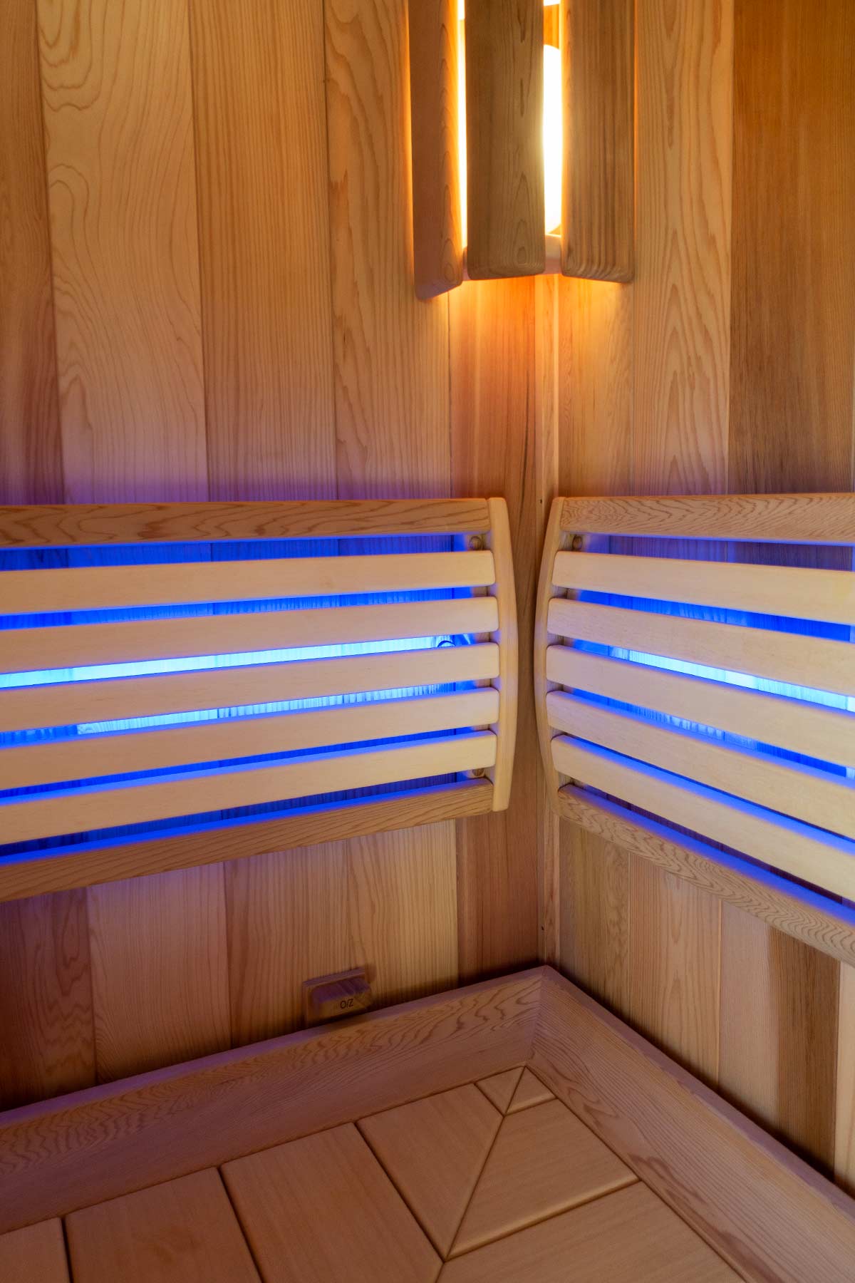 Tepelnou pohodu zajišťuje saunové topidlo EOS ThermoTec 9 kW ve spojení se 2 teplotními čidly. Ve stropě jsou bodová světla a v zádových opěrkách RGB LED pásky. Vše řídí regulace EOS Comact DC v bílé barvě.