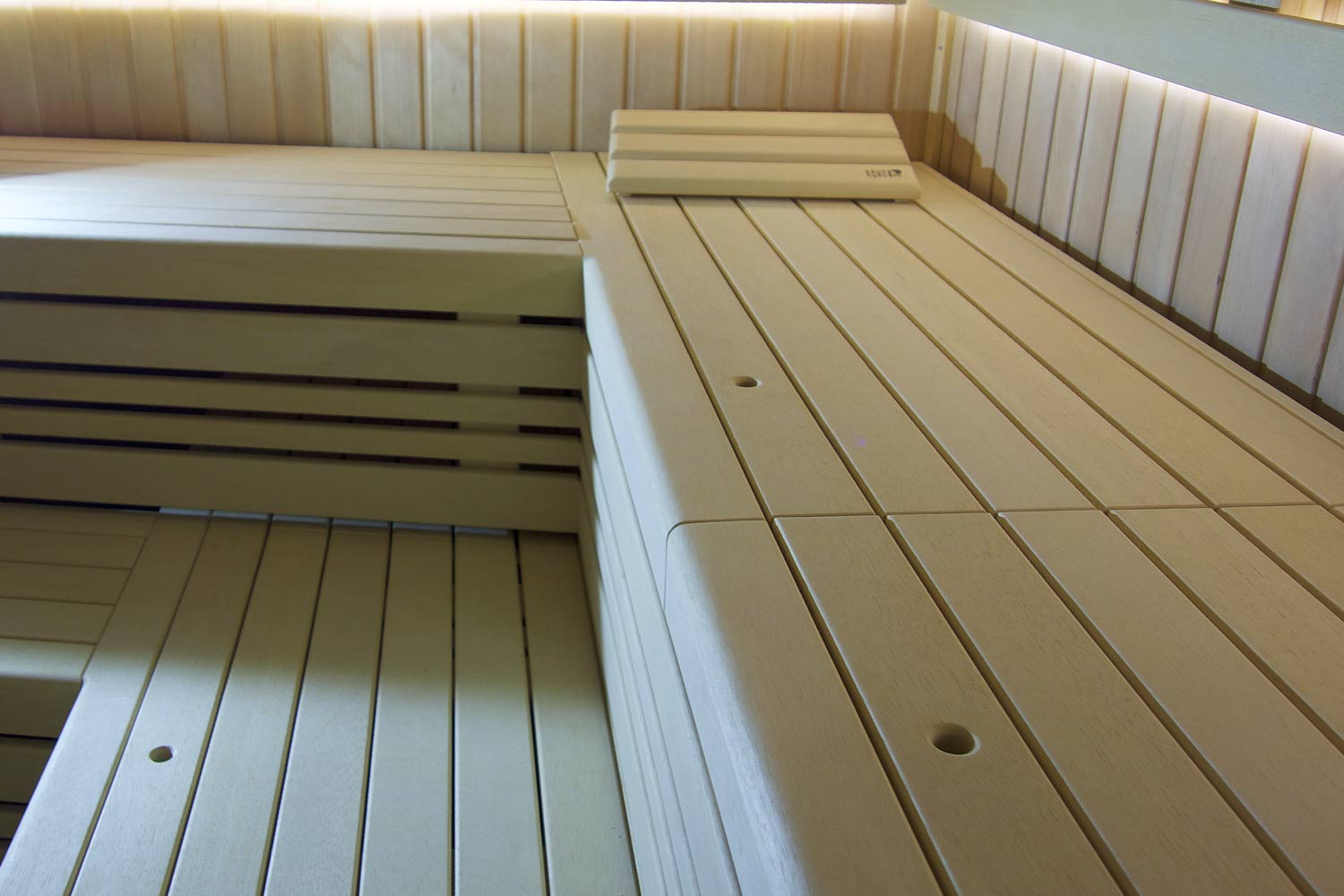 Uvnitř sauny je obklad z hemlocku soft šíře 14 mm, lavice a anatomické opěrky zad i rošt jsou z africké vrby abachi vhodně kombinované s kanadským cedrem.